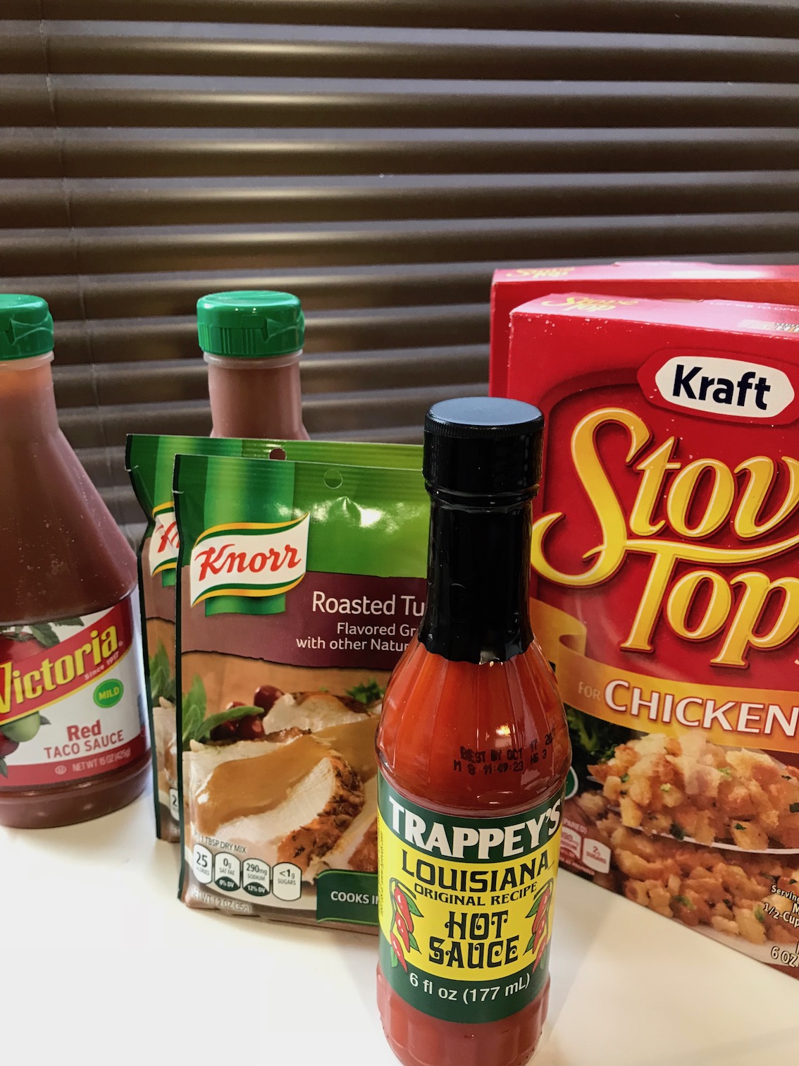 所用でロスにいました。それで自分に持って帰ってきたお土産がこちら。ローストチキンを作るフィリング、グレービーや、タコスソース、ホットソース等。