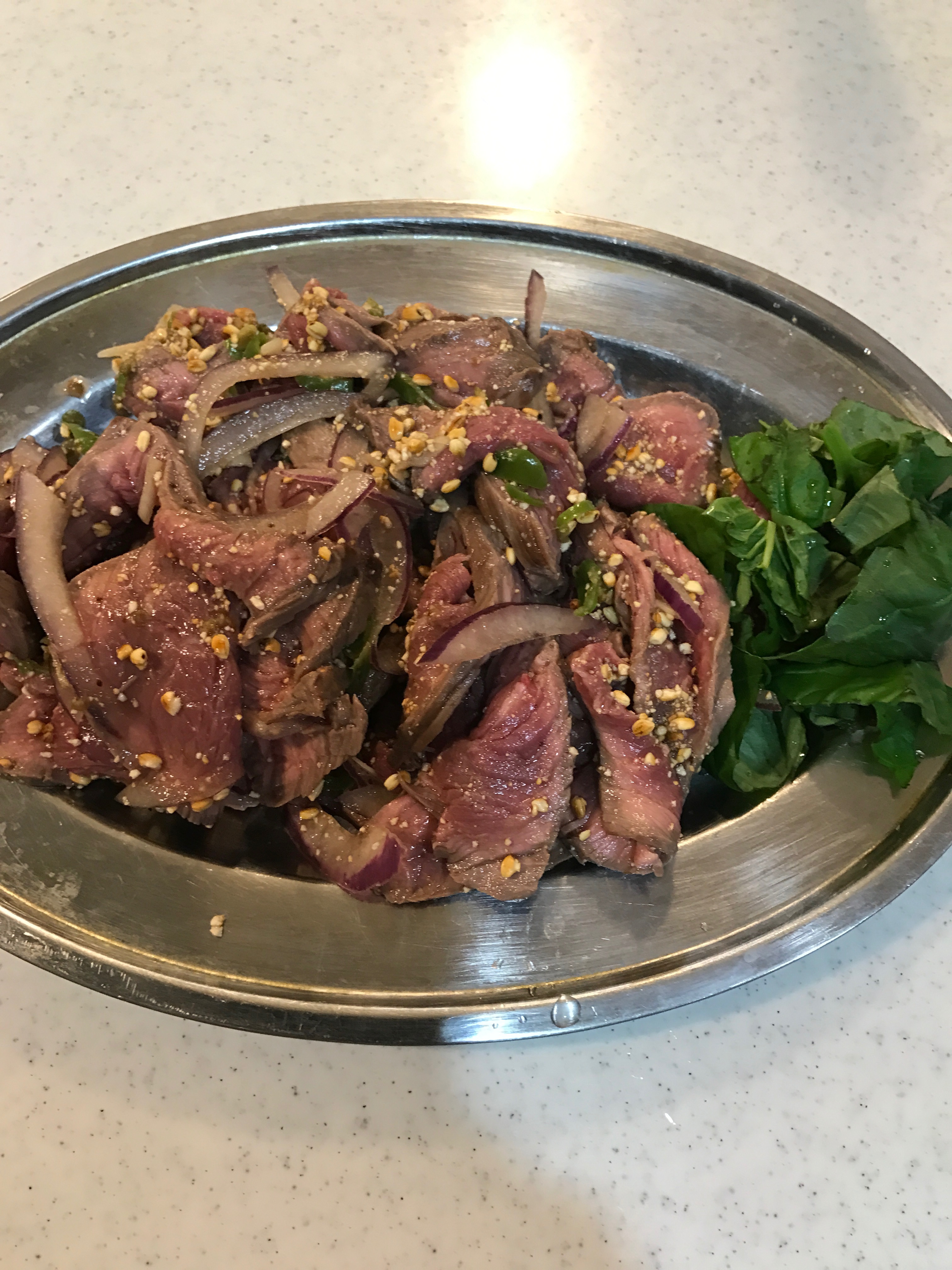 炊いた餅米以外を全部ボールの中でミックスします。そこにバジルの葉を刻んだものを添えます(写真)。味付けは、ナンプラー、レモン汁、唐辛子がバランス良ければ成功です。煎ってきつね色になった餅米を砕き、牛肉に塗すことになります。これだけでも十分異国の味なのですが、究極の食べ方を教えます。
