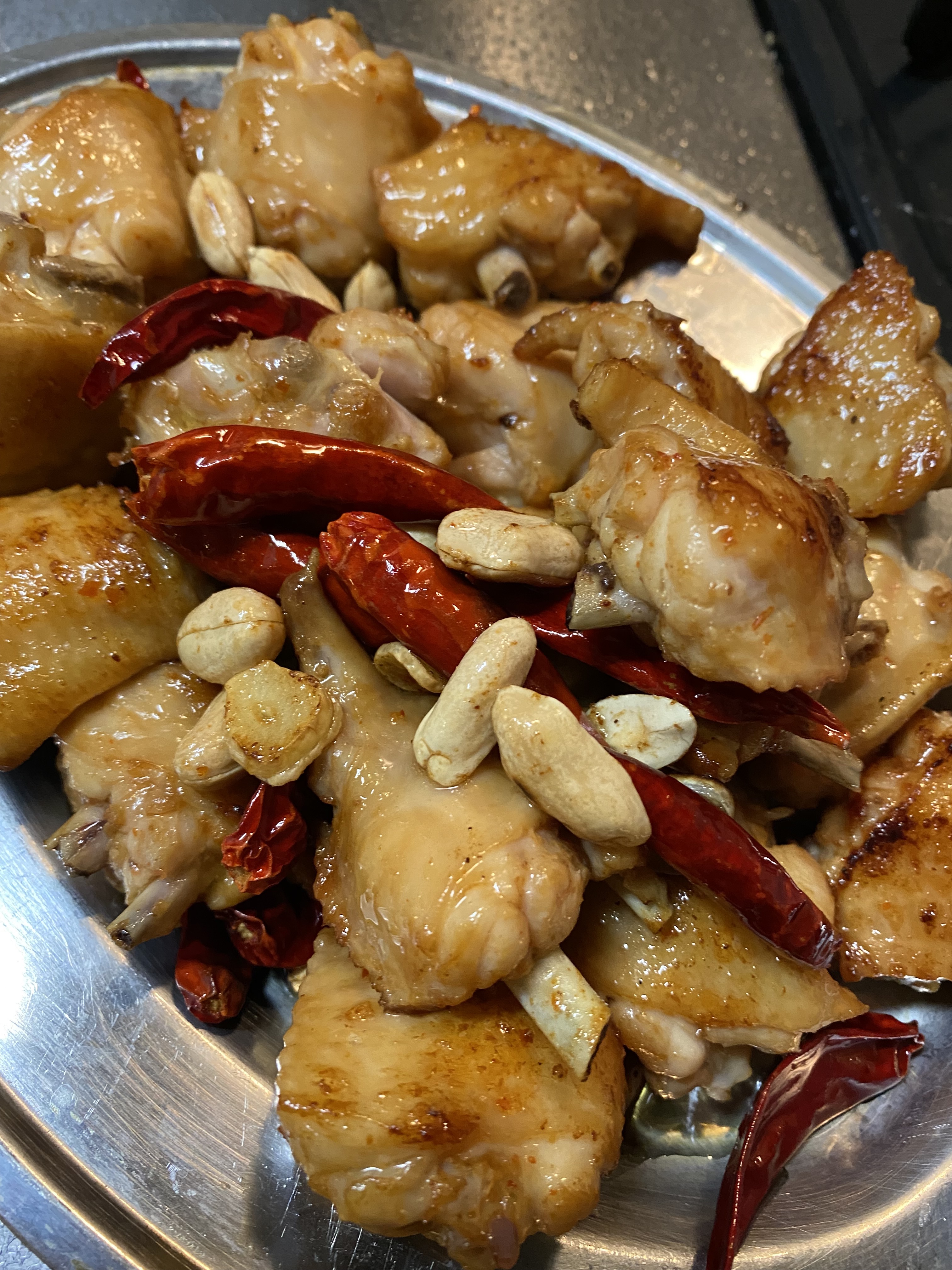 につけ込み、素揚げし、そのあと、ニンニク、山椒、ピーナッツ、唐辛子と炒めたものです。久々のヒットです。
