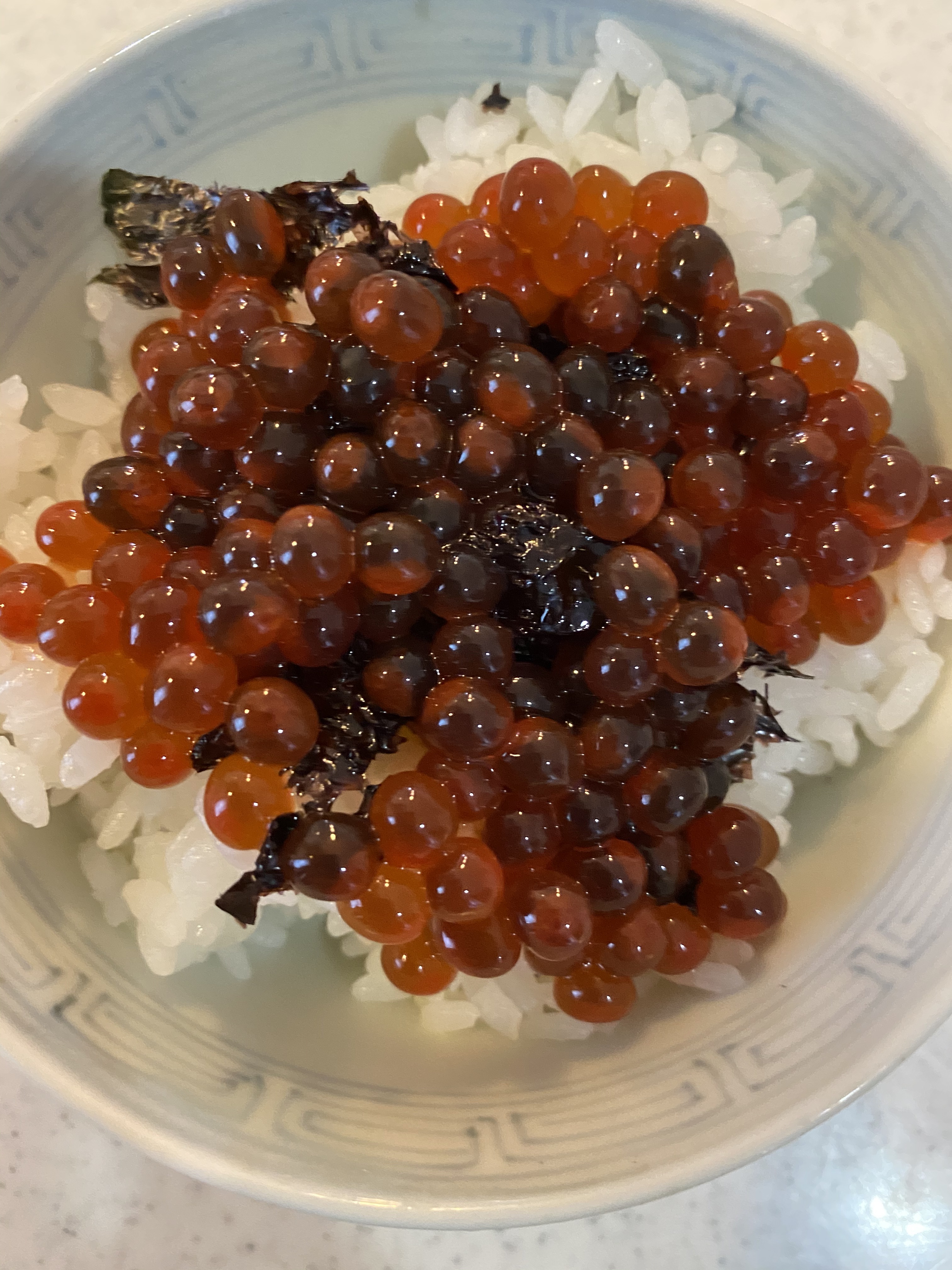 この山形式冷やしラーメンは、キンキンに冷えています。ダシは地鶏親鶏のモモを4時間、超弱火でダシを取りました。めっちゃ美味しかったです。プラス自家製いくら丼です。