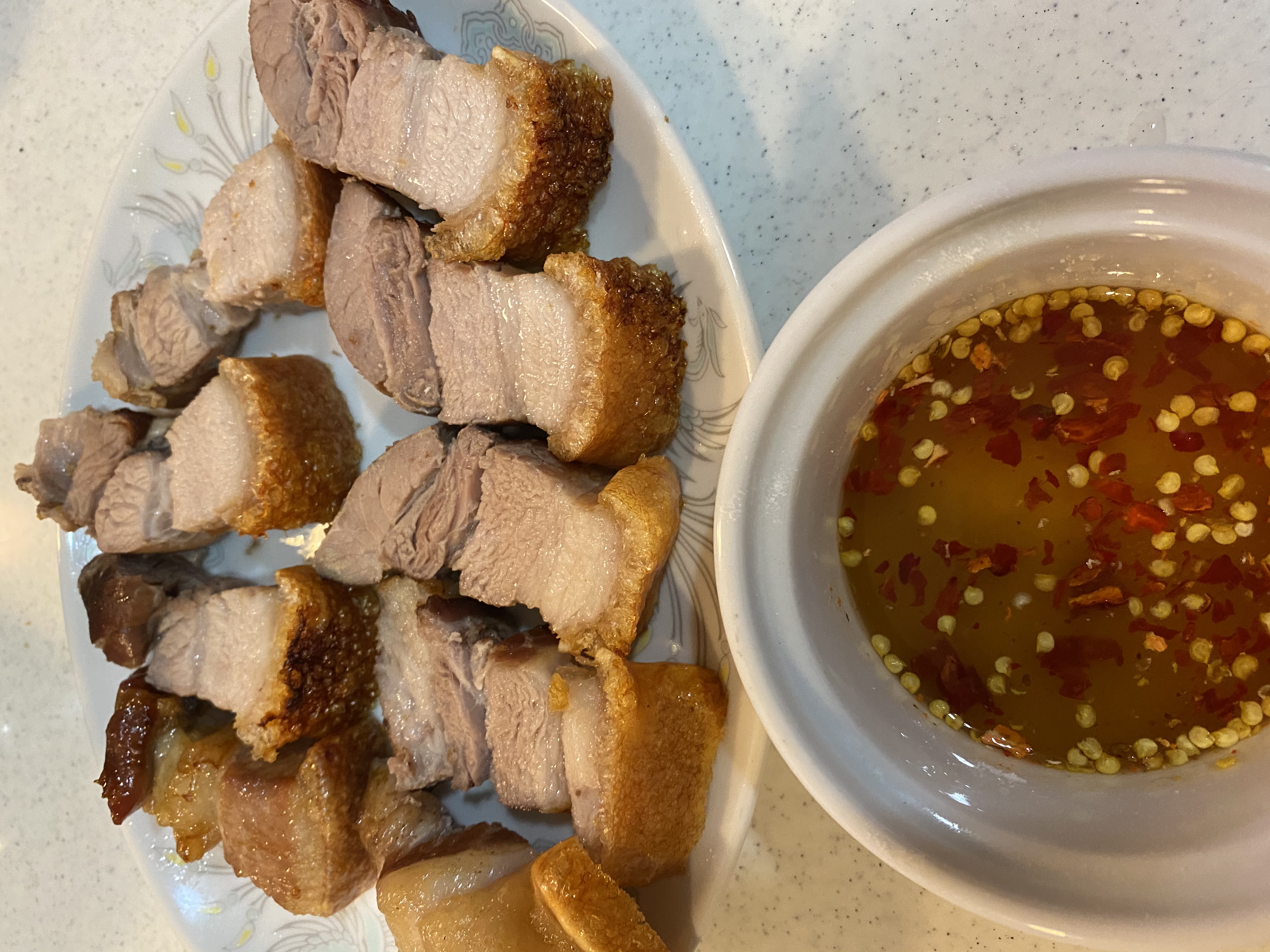 初めて成功した!今まで何度失敗したことか。失敗の理由は乾燥を充分にさせなかったことにあった。24時間、冷蔵庫に放置することで成功できました。皮はおせんべいのようにパリパリ!これがほしかった。タレは、ナンプラー、唐辛子、砂糖、レモンジュース、お米をこがしたものを砕いたもの、が入っています。