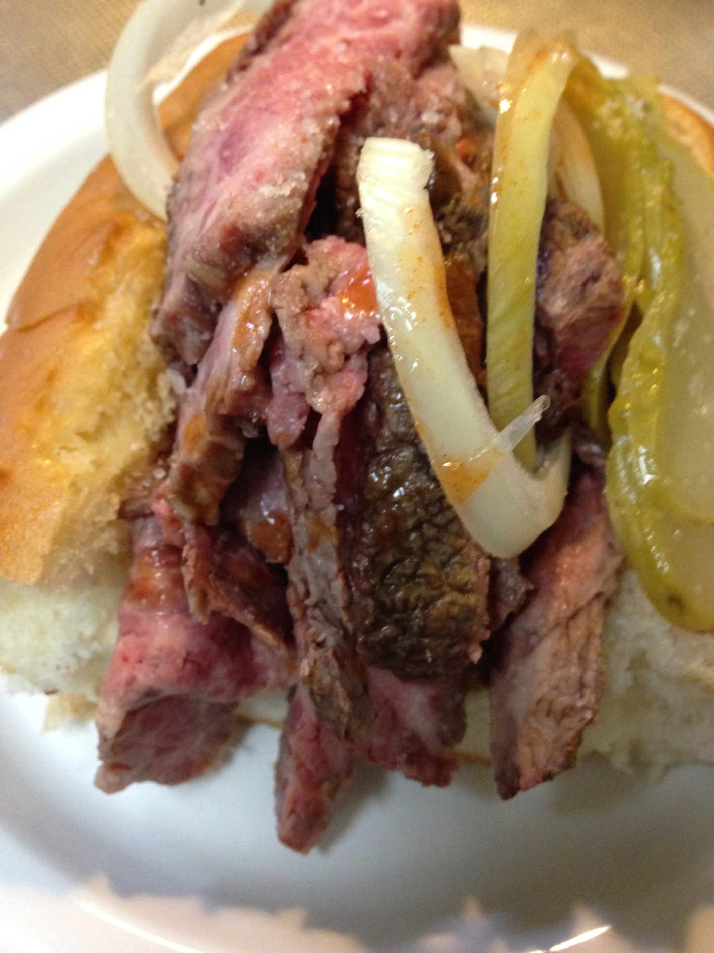 厳密にはビステッカ(炭火焼)の残り。 文句なしに美味しいです。パンローストビーフタバスコオニオンピクルス(甘くないもの)マスタード(アメリカン)塩胡椒
