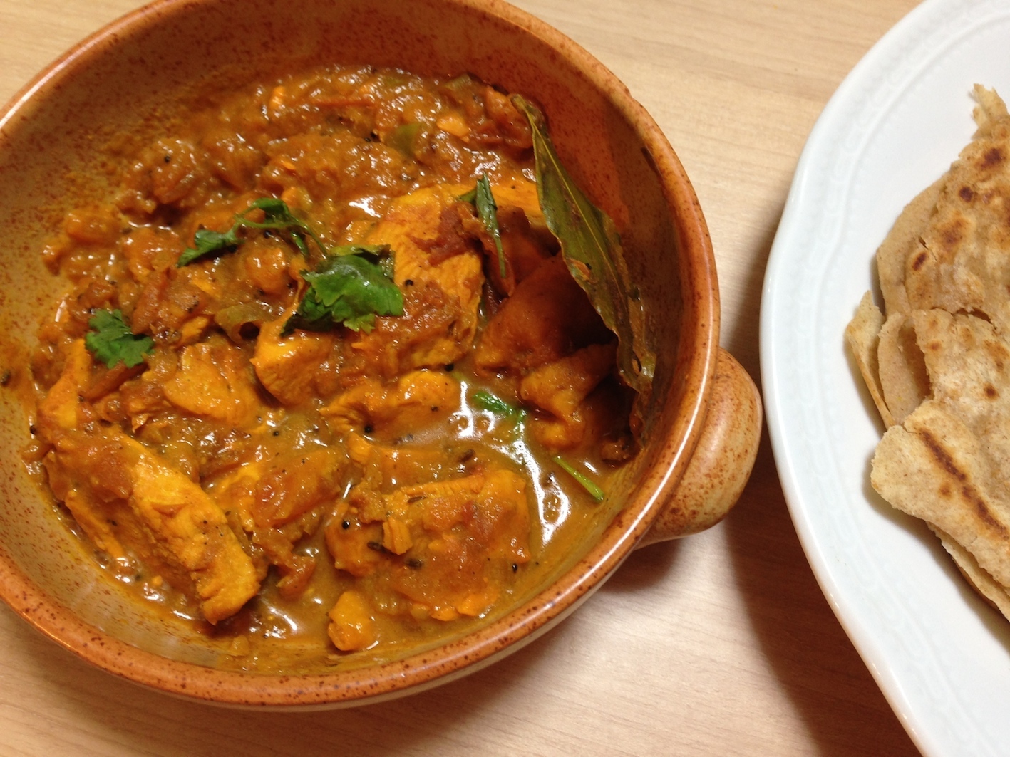 まずパラタというのはパンの一種で、本来は全粒粉を使う。バターを練り込み、ある程度パイのような構造にして焼く、とてもシンプルなパン。チキンチリは、とりの胸肉と青唐辛子を使ったカレー。分量では5本の青唐辛子となっていたので恐ろしくなり3本に減らした。それでも、顔から火が出るような辛さ;;;。この文章を書いているだけで汗が出てくる;;。
