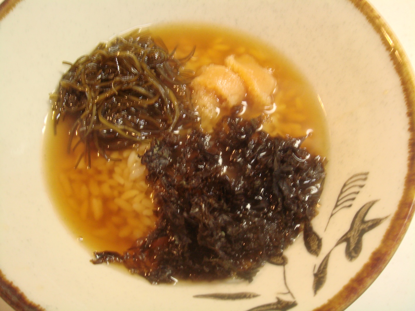 肉類を煮込んで濃厚なスープを作る。万が一濃厚なスープができないときは昆布を足す。あとは醤油と塩で味付けして若干濃いめのスープに仕上げる。すぐ貝を入れ、旨味を出しておく。