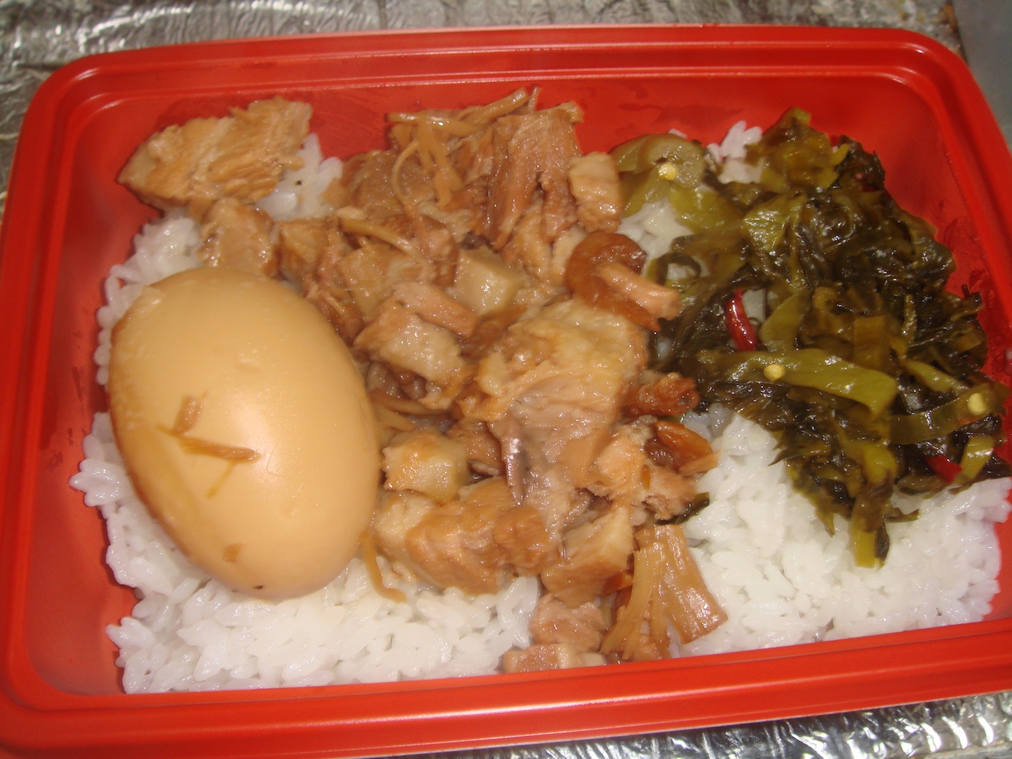 パーコーファンと読む。本来は骨付き豚肉の揚げ物。骨付きでなくてもできる。これは僕のオリジナルヴァージョン。豚のロースや肩ロースを買ってくる。醤油、砂糖、酒、五香、腐乳につけ込み一晩置く。さてここで注意。一晩以上は置かない事。一晩以内と言った方が良いかもしれない。漬けすぎるととんでもない味になってしまう。つけ込んだ肉に、片栗粉をまぶして揚げる。あまり低温だと片栗粉が落ちてしまうので、ある程度高温にする。ご飯の上に乗せ、高菜の炒め物を添える。