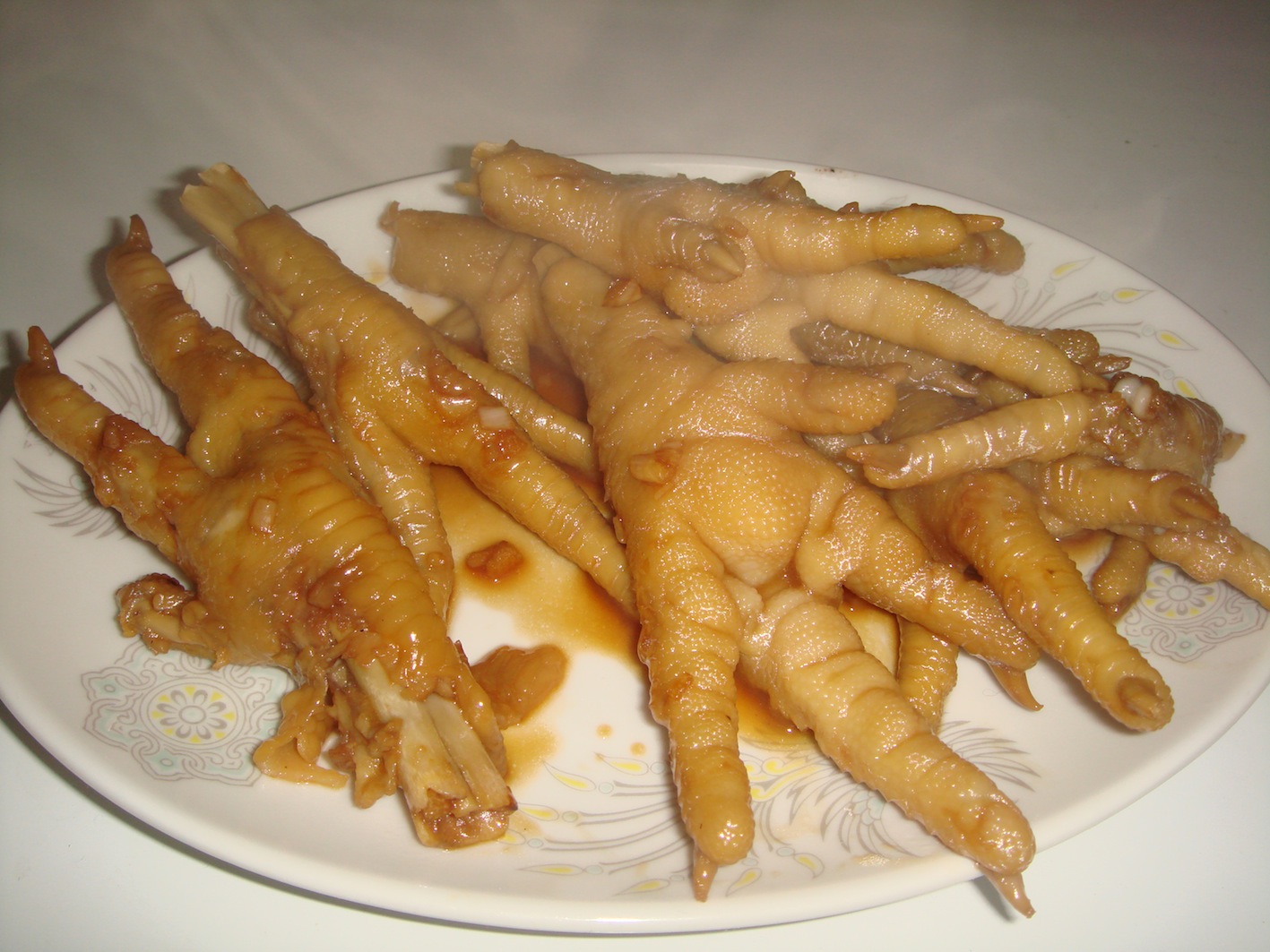 台湾ではごく当たり前の食べ物。日本人の多くは拒絶反応を起こす。本来これは、爪の部分を包丁でカットしなければならない。色々な調理法があるんだけど、僕は甘いのが極端に苦手なので、これには砂糖を加えていない。足は、真ん中の部分が美味い。これを通称日本で「もみじ」と呼ぶ。20分くらい茹でて、柔らかくなったら、茹で汁を少し残しておく。フライパン(中華鍋ではくっついてしまうので)にこのゆであがった足とニンニクのみじん切りを加えて炒め、茹で汁を入れ(適量)、醤油、酒を加えて炒め煮にする。合うお酒:ビール、紹興酒
