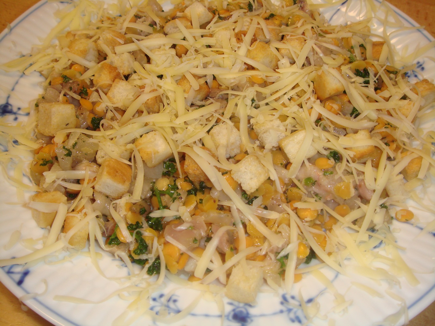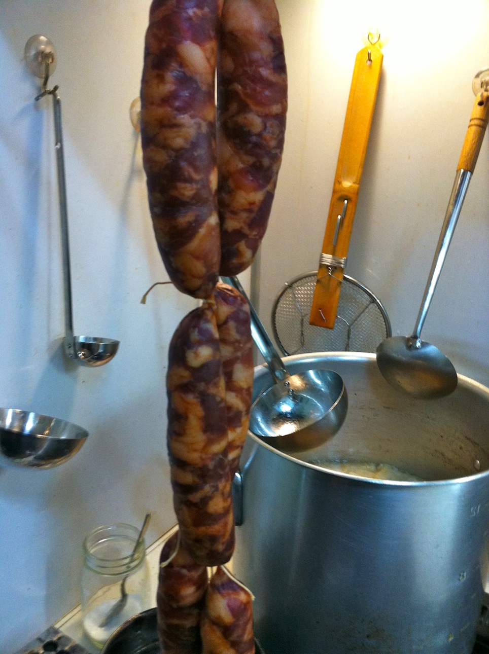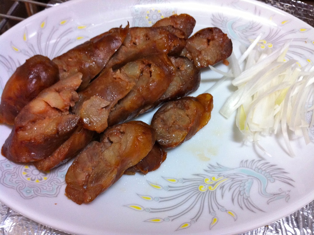 台湾腸詰めである。これは本当に面倒;;。用意するもの:塩漬けの豚の腸(フランクフルト用の太いもの)豚バラ肉 500グラム五香X醤油砂糖ペットボトルの口の部分を切り取ったもの(口から10センチの部分を切り取り、ロート(ジョウゴ)を作る)タコ糸豚バラ肉を細かく切る。1つ1つの片を親指の先端くらいの大きさにする。それに、x(適量)、五香(適量)、醤油、砂糖をまぜたタレを加えるのだが、タレを味見して、若干甘すぎる位のタレに仕上げる。そうすると出来上がりはちょうど良くなる。塩漬けの腸を水でもどし、50センチくらいの長さ1本を切り、先端をペットボトルの口の部分にタコ糸でしっかりと縛り付ける。口で吹いて腸に空気を送り込み、腸の先端までねじれていない事を確認する。ロートの太い部分から肉をゆっくりと入れていく。ある程度詰まってきたら、それを手で、後ろの方に行くように、握りながら調節する。それを繰り返し、肉を全て腸の中におさめる。約15センチごとに節目を作り、そこをタコ糸で縛る。空気の入っているところは、2、3カ所針で穴をあけ、空気を出す。出来上がったものを一日干す。干し上がったら、1つ1つをはさみで切り、超低温でサラダ油を使い、揚げる。この温度は本当に注意。できる限りの弱火(もう消えるか消えないか寸前の温度)。最初は中火で油を熱してから、超弱火にする。腸詰めから細かい泡が出てくる程度。この時に火が強すぎると、腸が破れてしまう。5分くらい揚げたら、油を切り、斜めにスライスして、ネギを添える。合うお酒:ビール、紹興酒