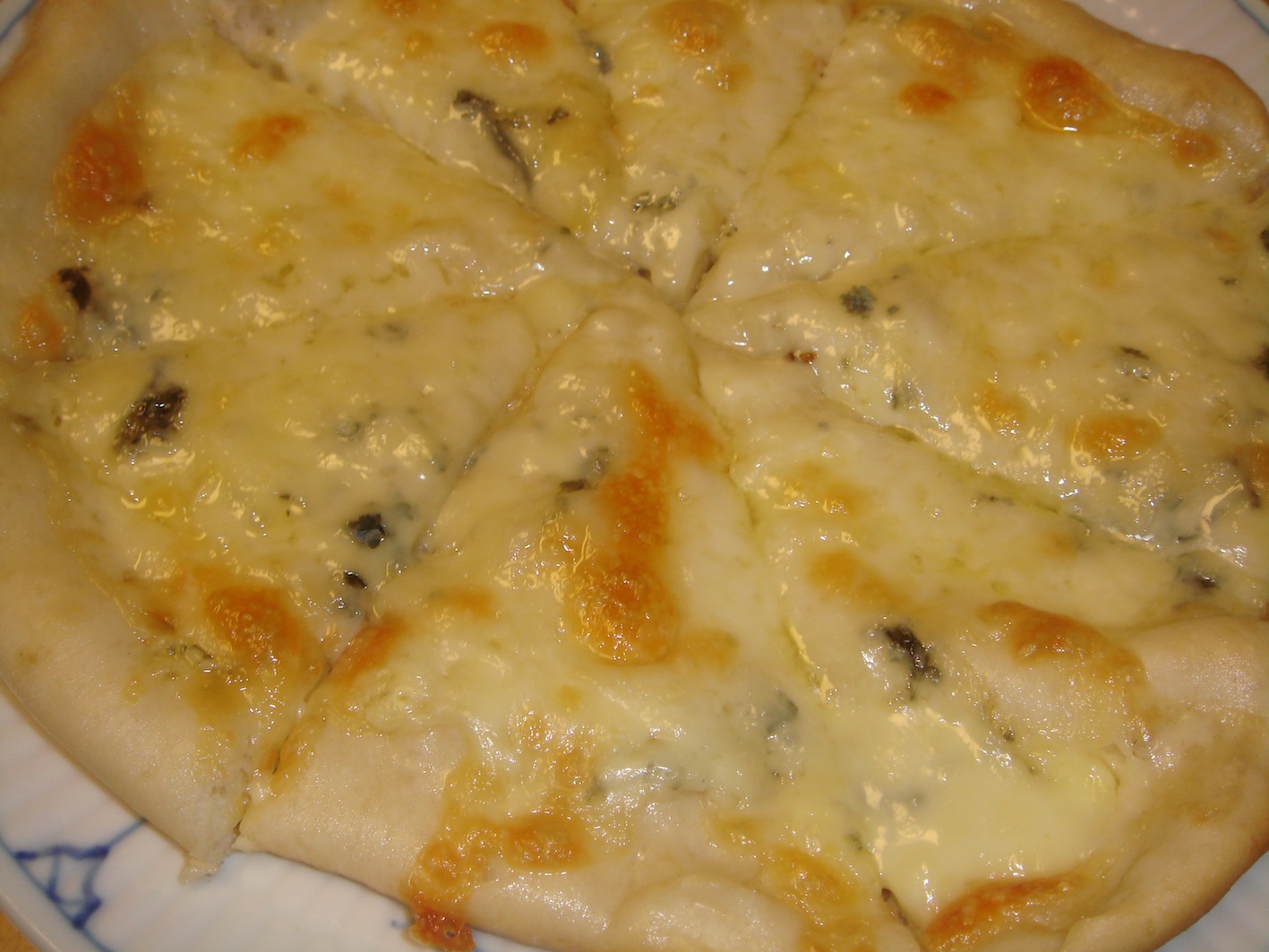 ピザは面倒だと思っている人もいるかもしれないが、意外と簡単。基本はこれ:薄力粉 300g 強力粉 300g ぬるま湯 300cc ドライイースト 小匙2杯 塩 オリーブオイル 適当つまり、薄力、強力、ぬるま湯が全部同じ数字だと覚えれば良い。あとはまぜてこねて発酵させて、トッピングを乗せて焼くだけ。これはクアトロフォルマージュといって4種類のチーズを乗せたピザ。必ず加えるのがブルーチーズ。これはロックフォールでもゴルゴンゾーラでも良い。こちらはミックス。ペパロニ、オニオン、など。合うお酒:ビール ワイン シャンパン
