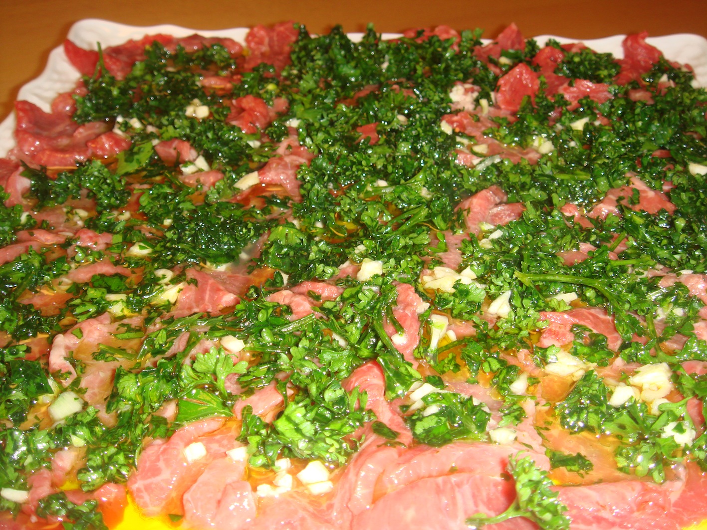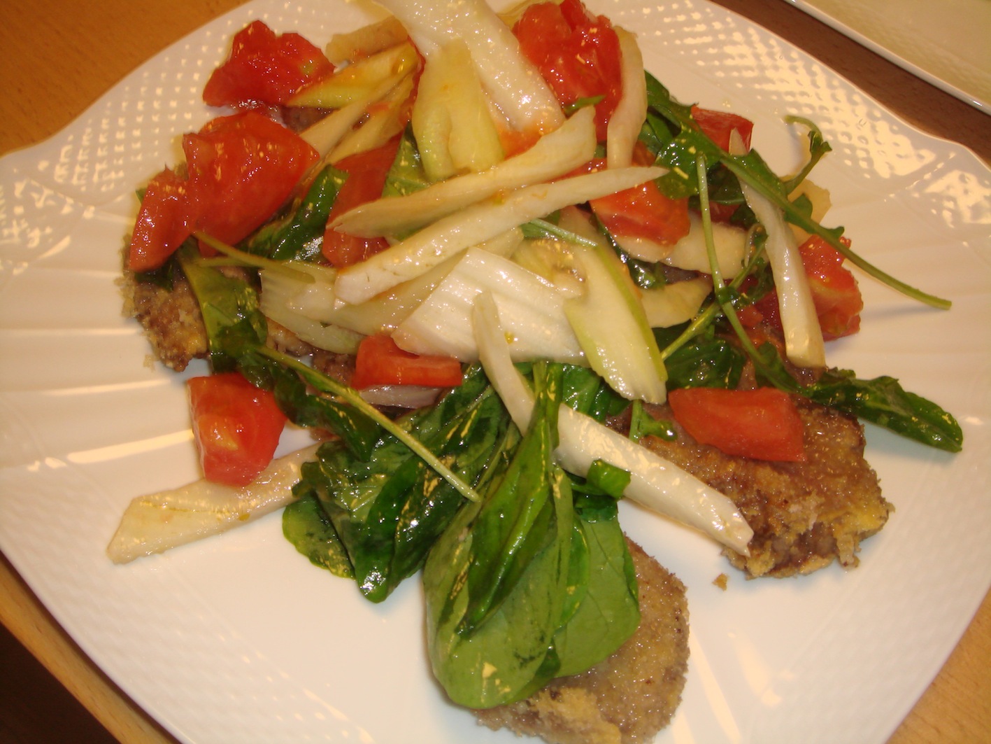 この料理はパーティーなどで人気があります。パン粉を付けて揚げた牛肉が一番下にあります。揚げて油を切った牛肉(本来は子牛を使う)の上に、セロリ、トマト、ルッコラをオリーブオイルと塩、レモンで和えたものを乗せ、完成です。
