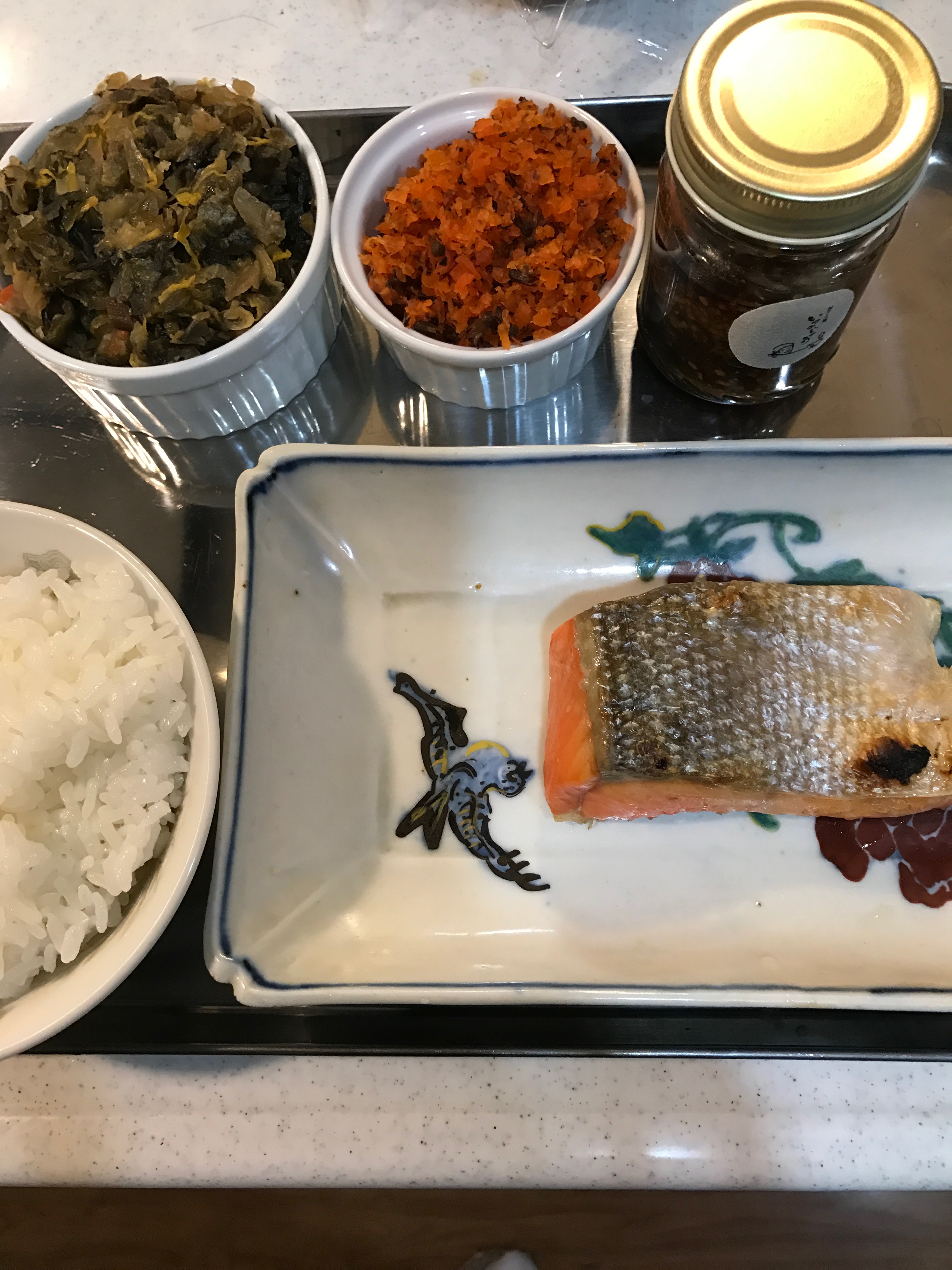 近くのスーパーで実演販売されていた鮭を言われるがままに信じて買ってきたら本当に美味しかった。ちなみに、漬け物3種は、山形と新潟と札幌のもの、特に山形(左)のは晚菊と言って不動の地位に位置する代表的な漬け物です。一番右のガラス瓶に入っているのは札幌・いせのじょう特製の「三升漬」です。米は特選のゆめぴりかです。結果、美味しいです。