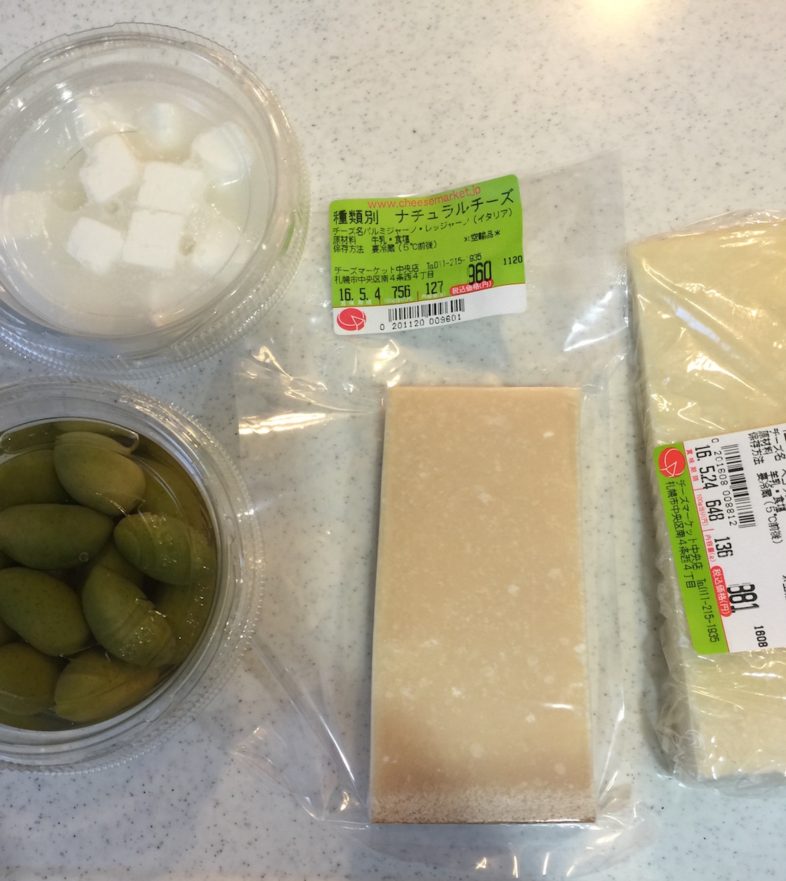 左下がオリーブ、左上がフェタ、真ん中が40ヶ月のパルミジャーノ、右がペコリーノです。