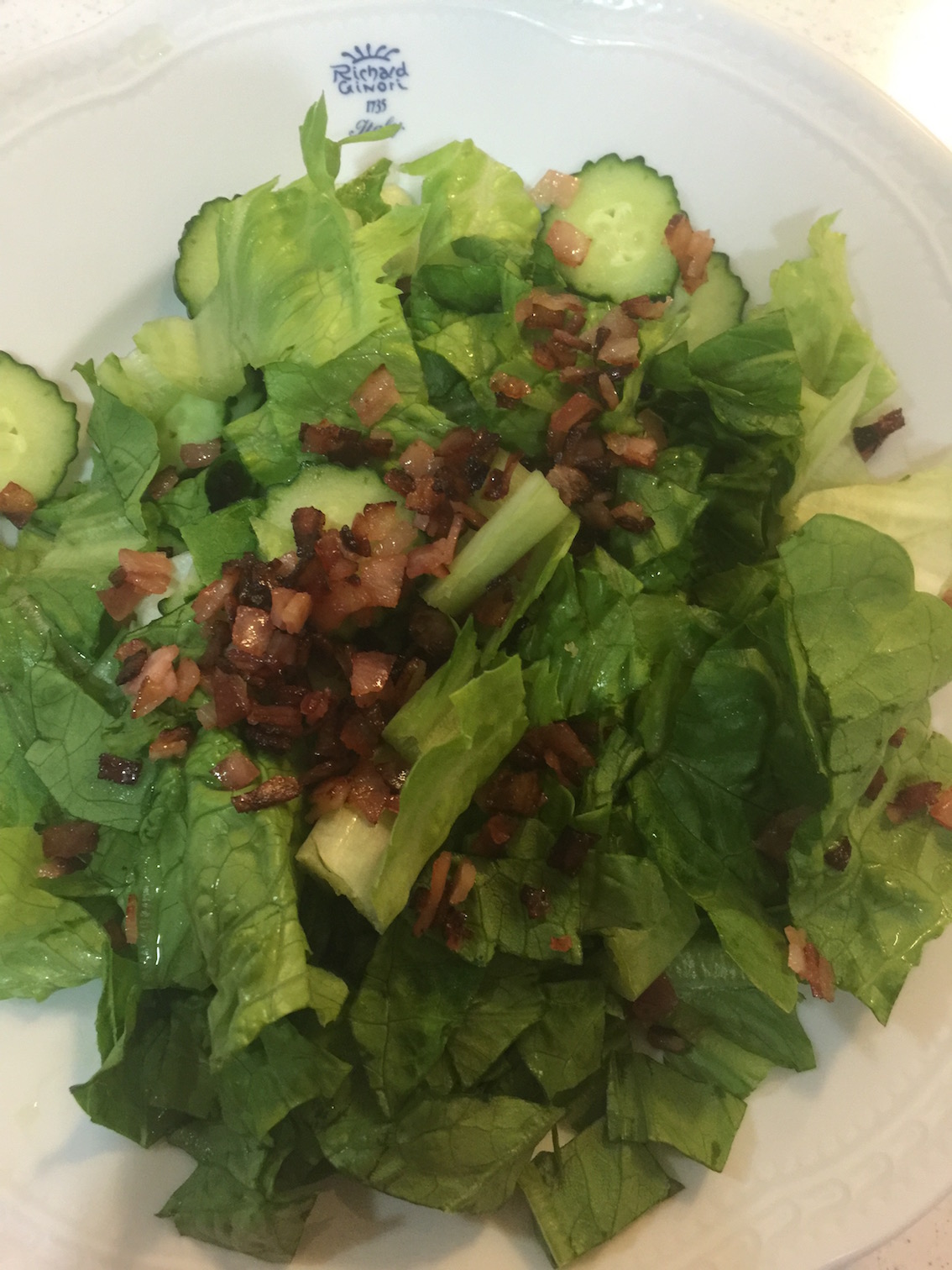 このレタスがいつでも手に入る環境にある環境は嬉しい。今日は横着をして市販のドレッシングにしてしまいましたが、それでも十分美味しいです。本来はブルーチーズドレッシングなどのクリーミータイプがよく合うかもしれないです。トッピングはベーコンビッツで手作りです。これがあると無いとでは雲泥の味の差があります。