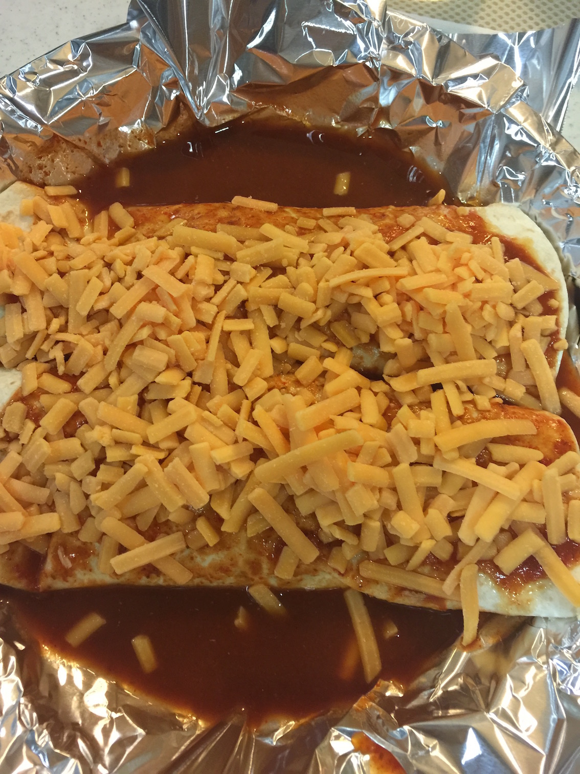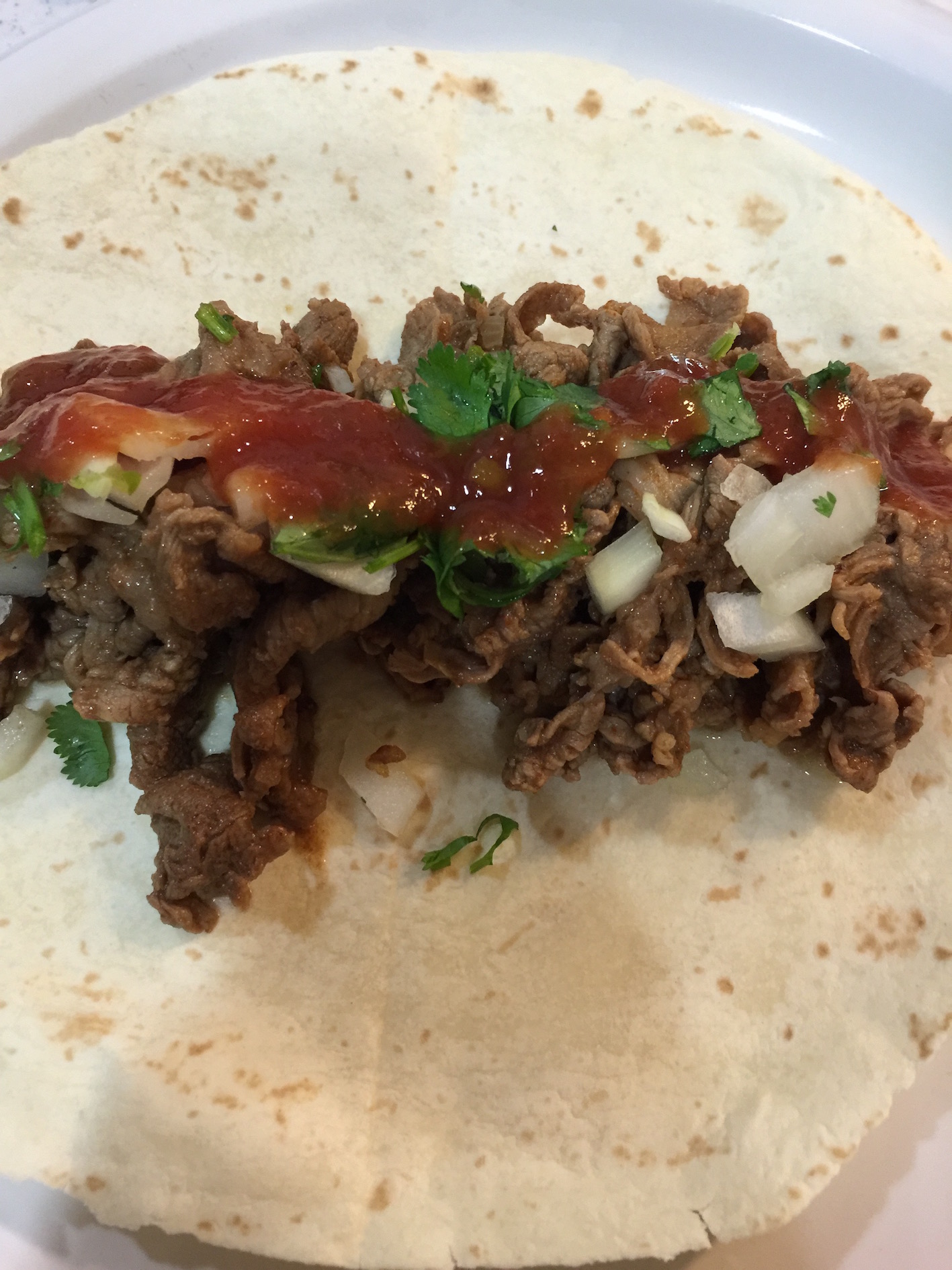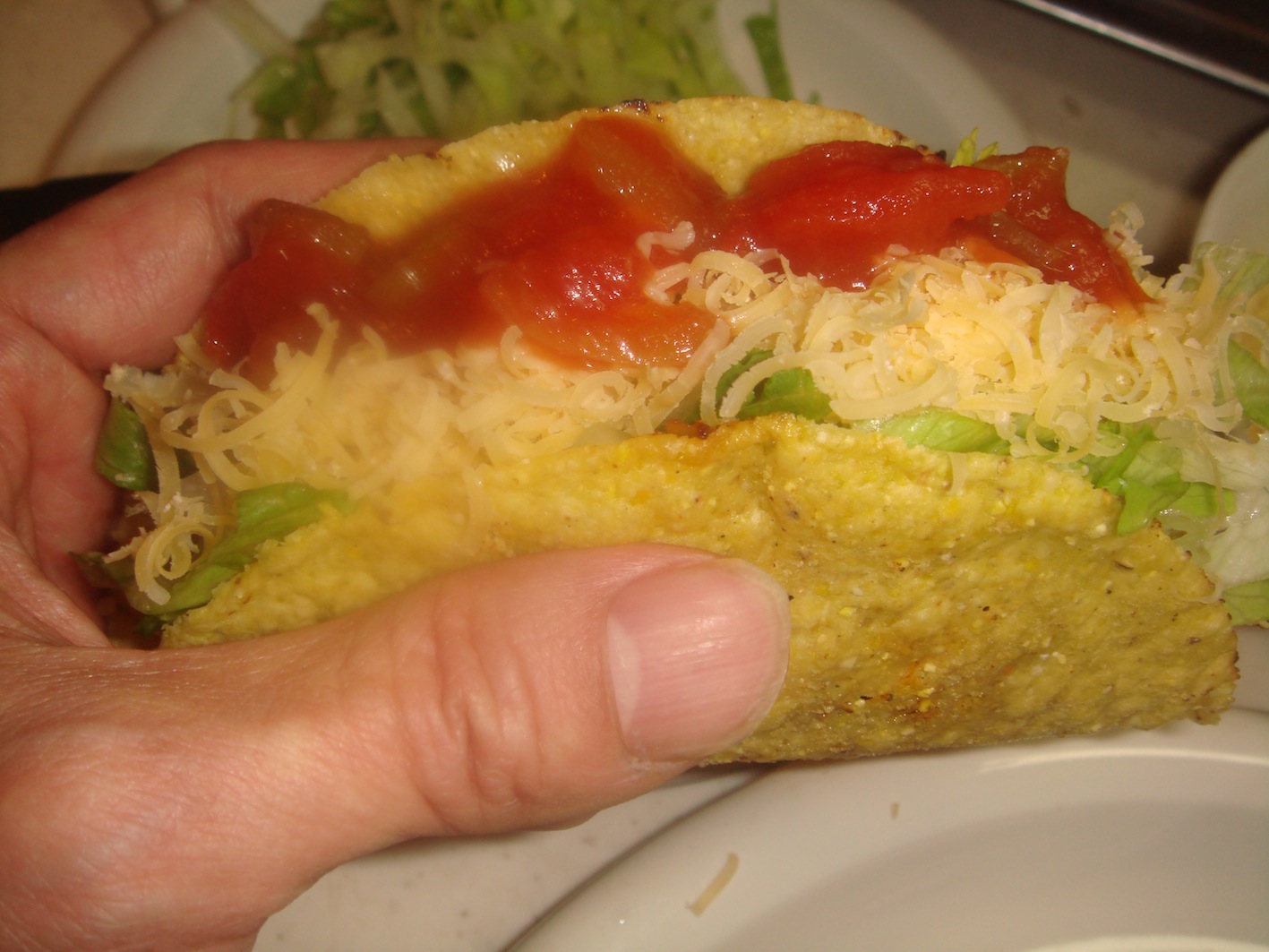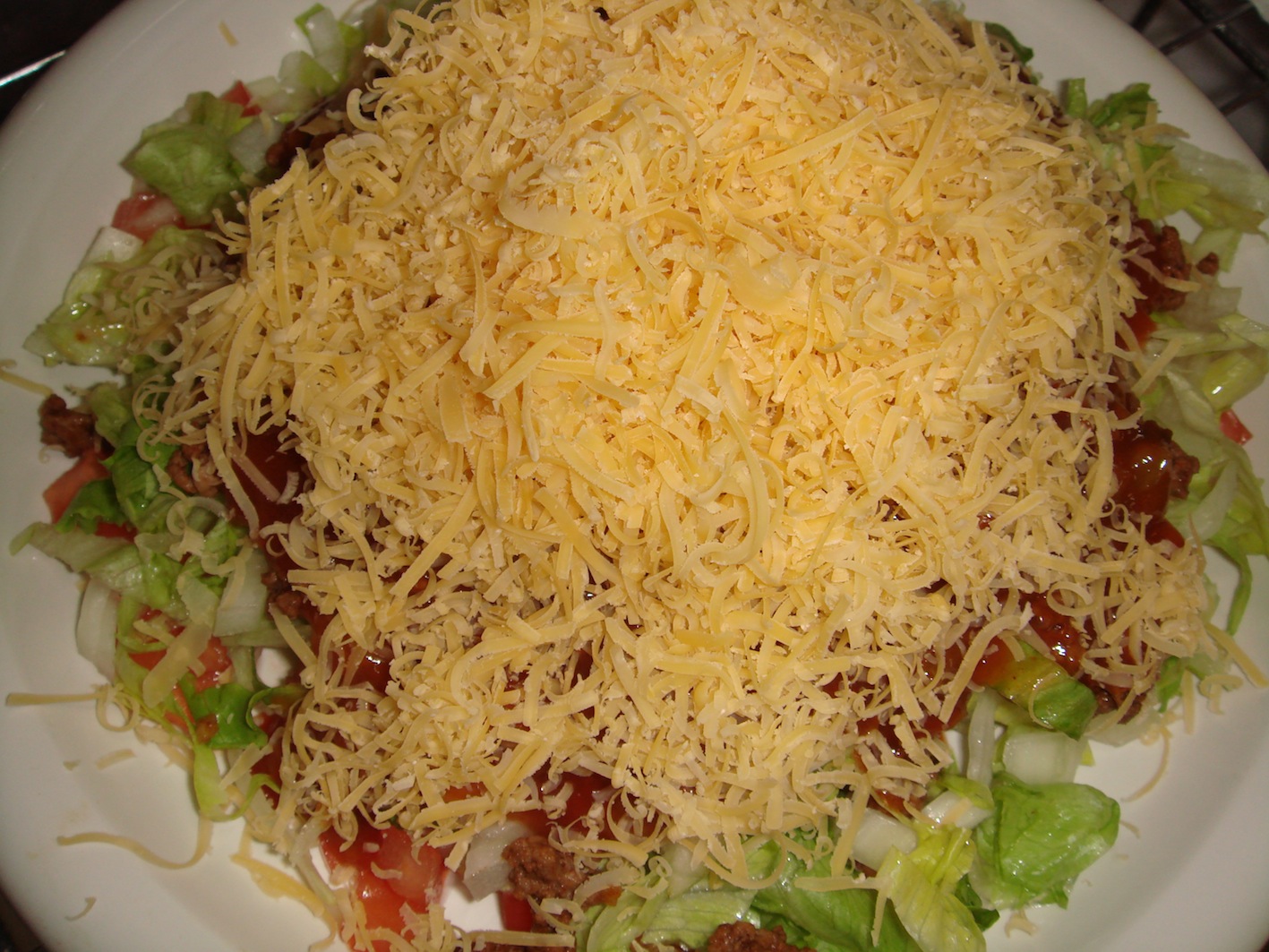 レタス(幅の厚い千切り),トマト(乱切り)、オニオン(微塵切り)、を用意しておいて、一番下にレタス、次にトマト、オニオン、牛ひき肉、を乗せ、タコスソースをたっぷりかけ、サワークリームを散らし、最後に糸状のチーズをたっぷりと乗せる。